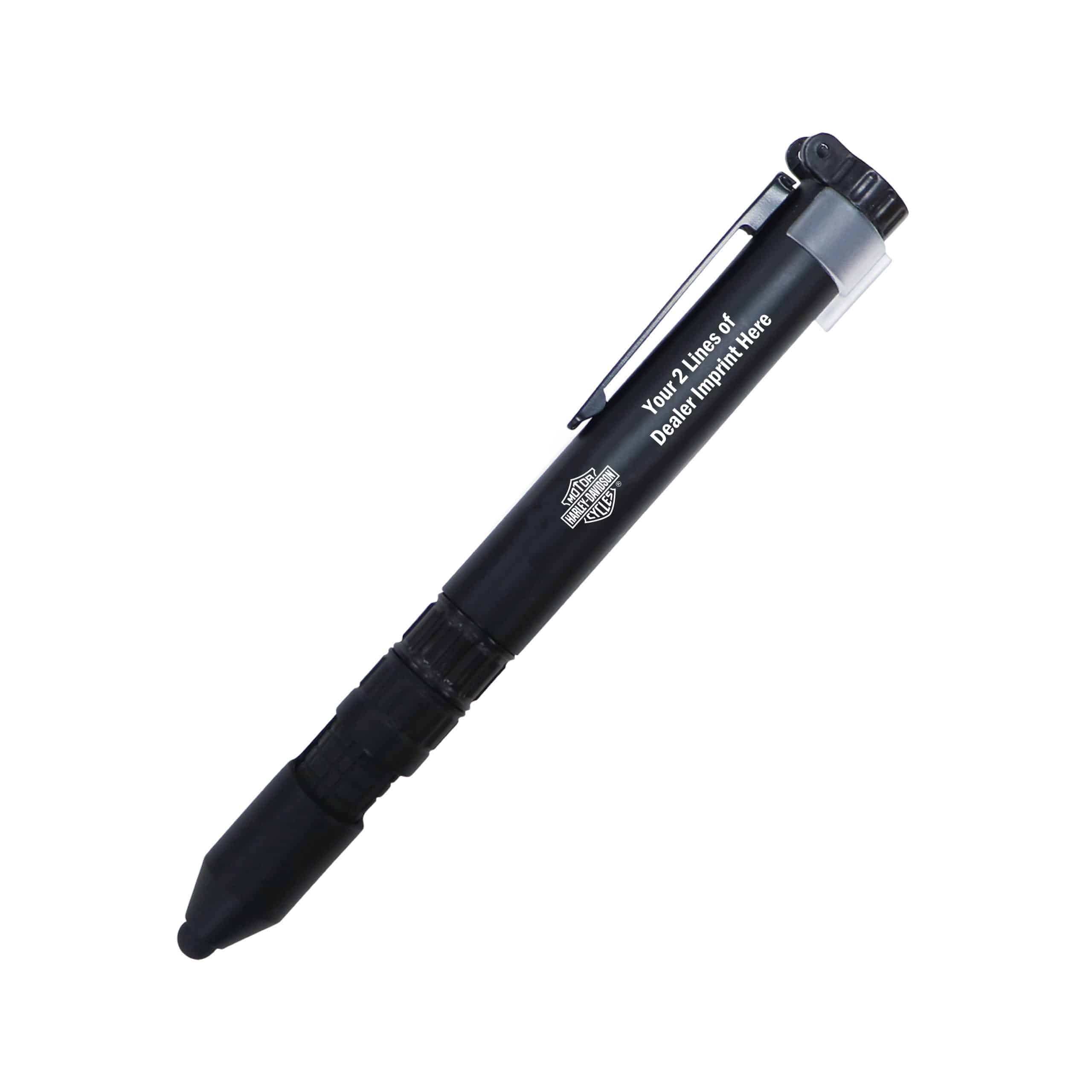 Beyond the stylus tip, this tool doubles as a ball-point pen and features a flashlight, compass, cell phone stand and small screwdriver (fitting both Philips and standard screws) Printed with the Bar and Shield logo and 1-2 lines of dealer copy.